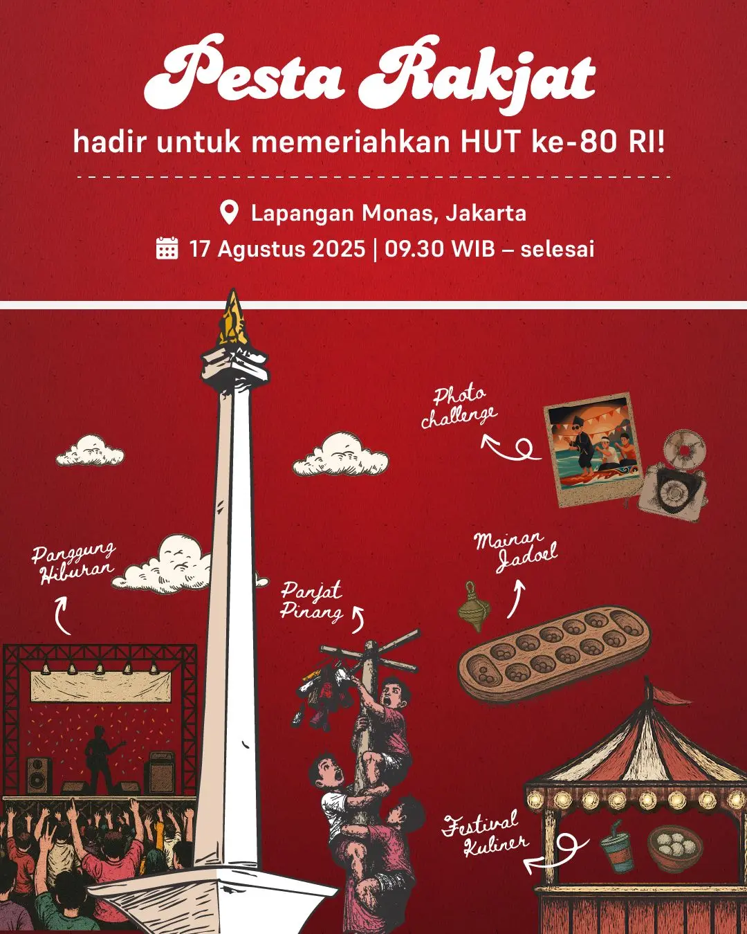 Pesta Rakyat diproyeksikan akan dipadati hingga 300.000 pengunjung sepanjang hari di Monas, dengan kemeriahan yang meluas hingga Jalan Sudirman-Thamrin dan Semanggi pada malam hari. Panggung utama di Monas akan menampilkan musisi nasional seperti Ntrl, D’Masiv, Ayu Ting Ting, dan Judika, yang akan ditutup dengan pesta kembang api.