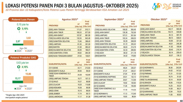 Berdasarkan rilis Berita Resmi Statistik pada 1 September 2025, Deputi Bidang Statistik Produksi BPS, Pudji Ismartini, menjelaskan produksi padi dari Agustus hingga Oktober 2025 diperkirakan sebesar 15,80 juta ton GKG, naik 4,16% dari periode yang sama tahun lalu. Secara kumulatif, total produksi padi dari Januari hingga Oktober 2025 diperkirakan mencapai 53,87 juta ton GKG, meningkat 12,17%.