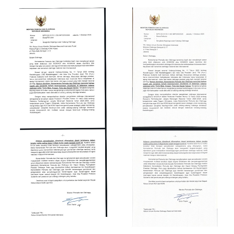 Hal ini tertuang dalam surat yang dikirimkan Menpora kepada Ketua Umum KOI dan KONI pada 1 Oktober lalu. Menpora memberikan batas waktu penyelesaian sengketa paling lambat tiga bulan, yakni sampai akhir Desember 2025.